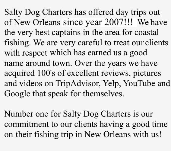 So if you want to hire a fishing charter in the greater New Orleans area, Salty Dog Charters will not let you down! You can expect a day filled with beautiful scenery, fast paced speckled trout and redfish action, and an experienced coastal fisherman to guide you to the catch of a lifetime. Salty Dog Charters prides itself on being for the customer. Do not expect to be bossed around by your guide. We love to put people on fish because of that smile they get when they catch their beauty. That is why we are called "guides" because we help the client do it themselves. When you get on the boat with Salty Dog Charters you are part of a team. With the goal of packing' that ice chest with tasty redfish, speckled trout, and flounder for your dinner table. And we will help you achieve that goal, and make sure you have a great time doing it! So if you want to hire a guide and charter a trip in the greater New Orleans area give Salty Dog Charters a call!
